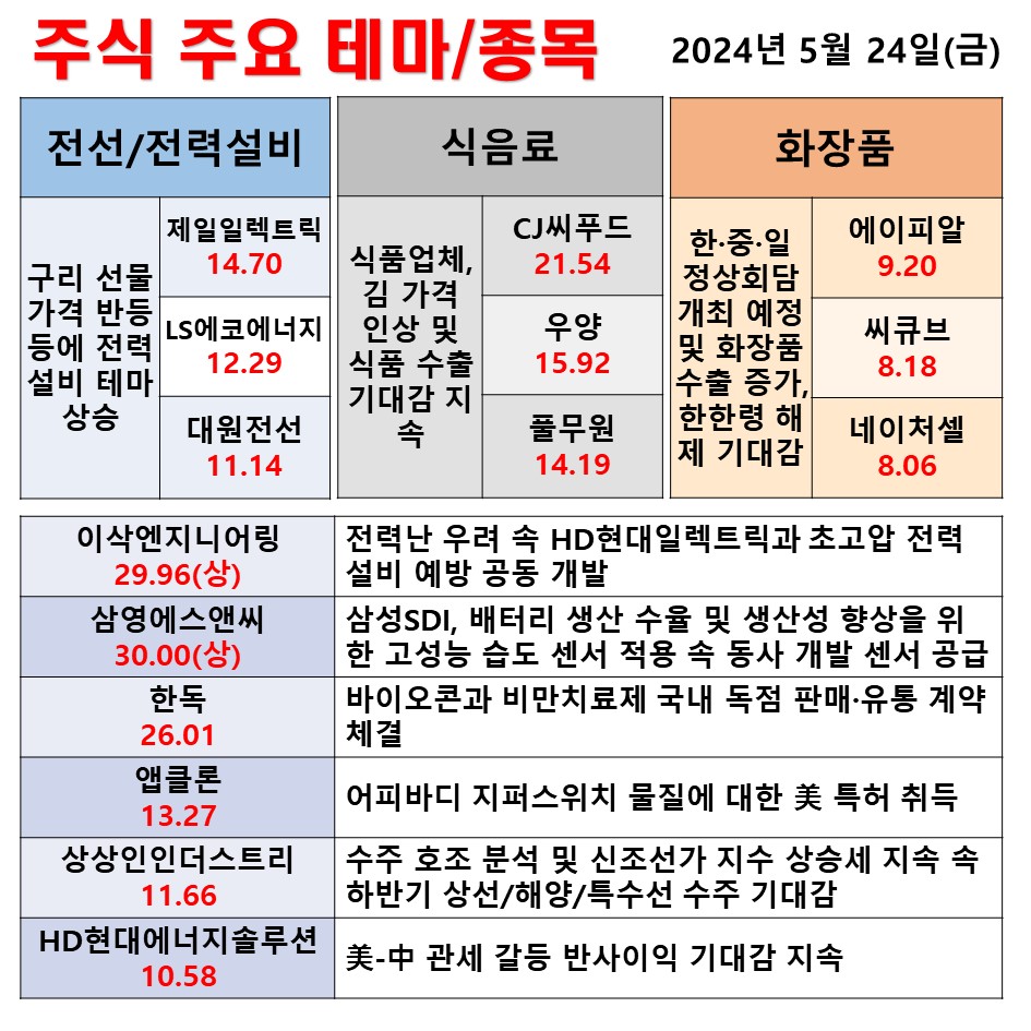 5월 24일 일일 동향 전선/전력설비 식음료 화장품 #테마 #상한가 #주식 #투자