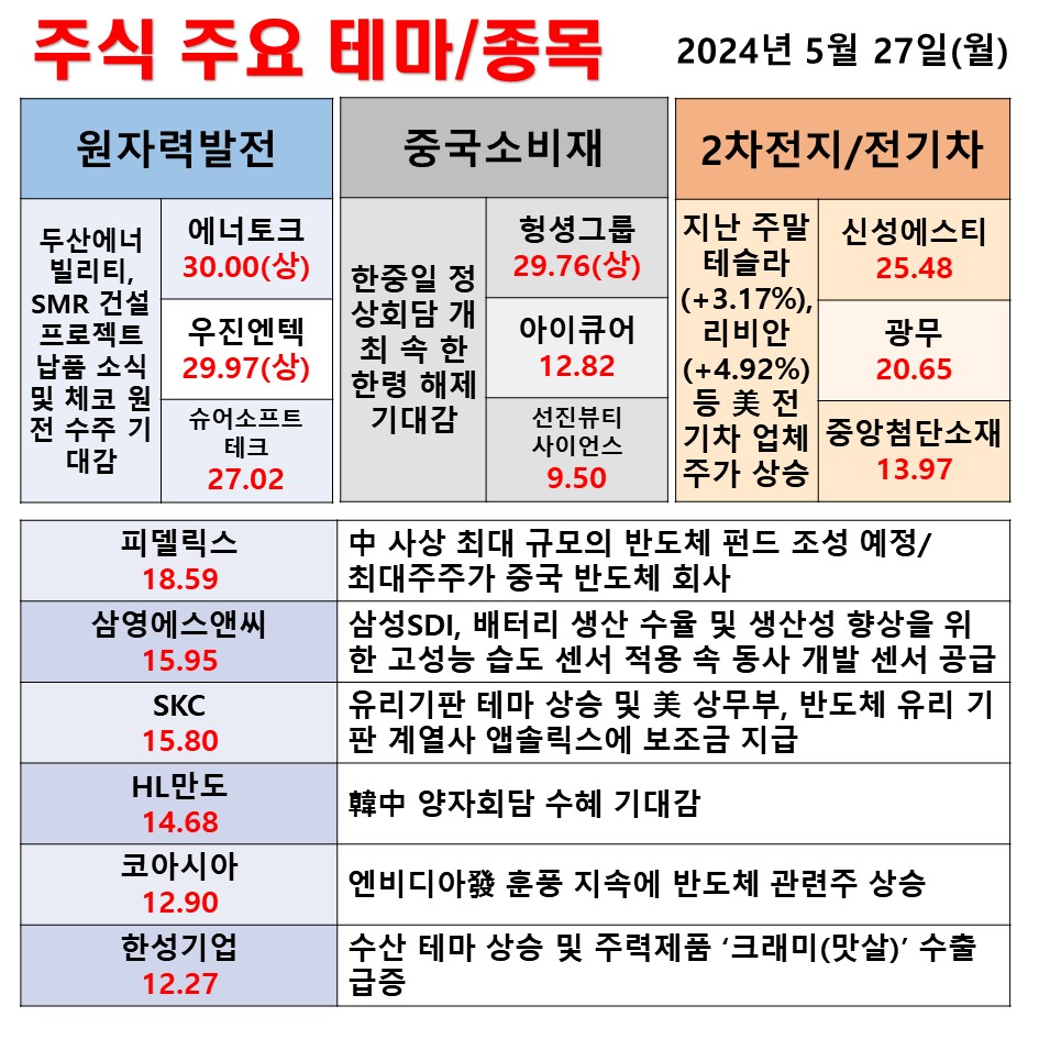 5월 27일 일일 동향 원자력발전 중국소비재 2차전지/전기차 #테마 #상한가 #주식 #투자