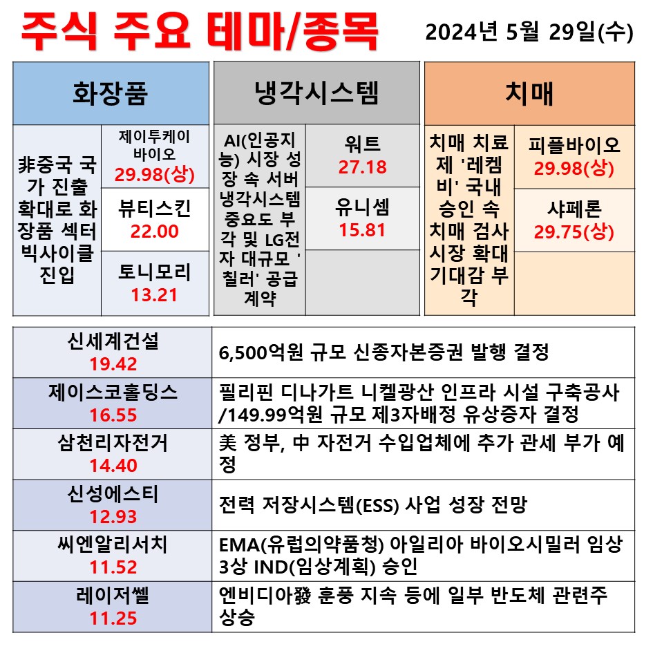 5월 29일 일일 동향 화장품 냉각시스템 치매 #테마 #상한가 #주식 #투자
