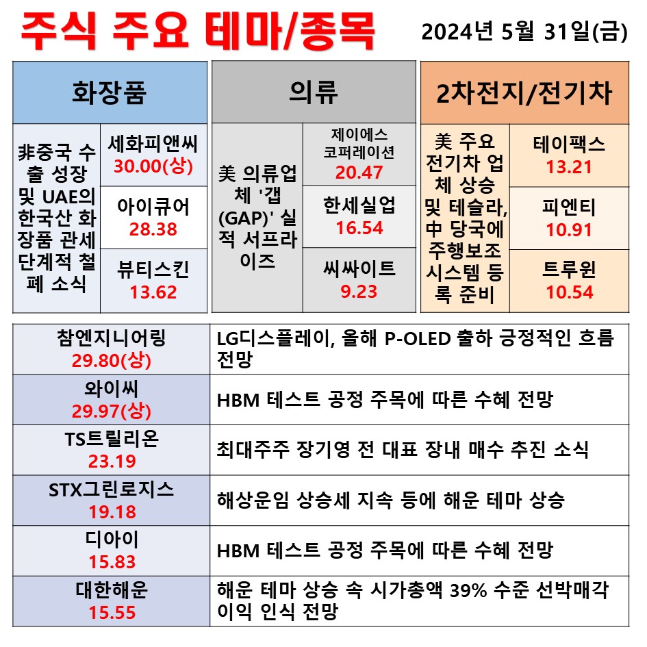 5월 31일 일일 동향 화장품 의류 2차전지/전기차#테마 #상한가 #주식 #투자