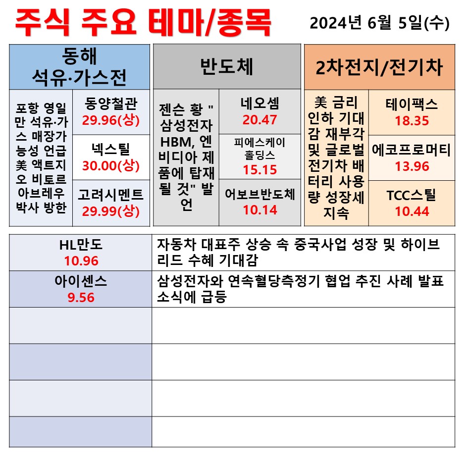 6월 5일 일일 동향 동해석유가스전 반도체 2차전지/전기차 #테마 #상한가 #주식 #투자
