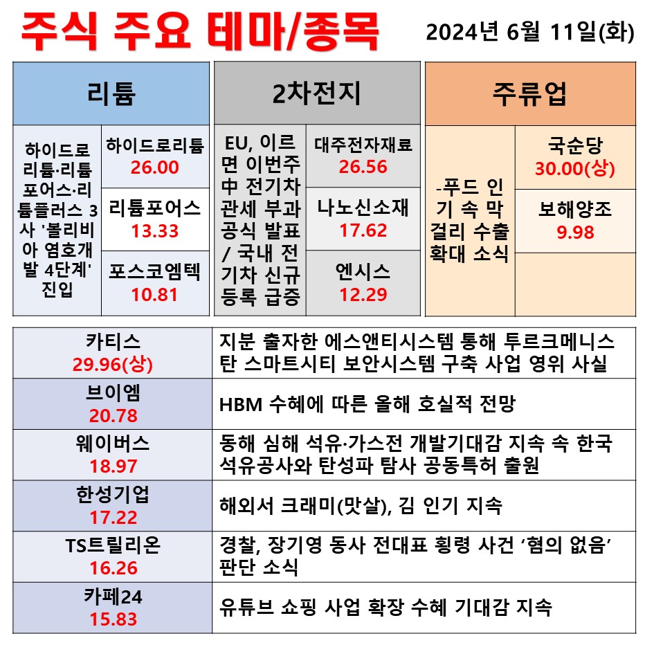 6월 11일 일일 동향 리튬 2차전지 주류업 #테마 #상한가 #주식 #투자