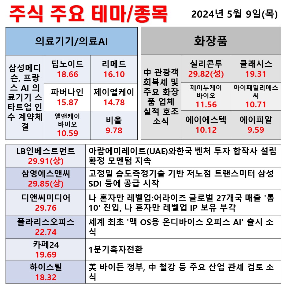 5월 9일 일일 동향 의료기기/의료AI 화장품 #테마 #상한가 #주식 #투자