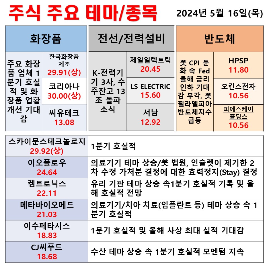 5월 16일 일일 동향 화장품 전선/전력설비 반도체 #상한가 #주식 #투자