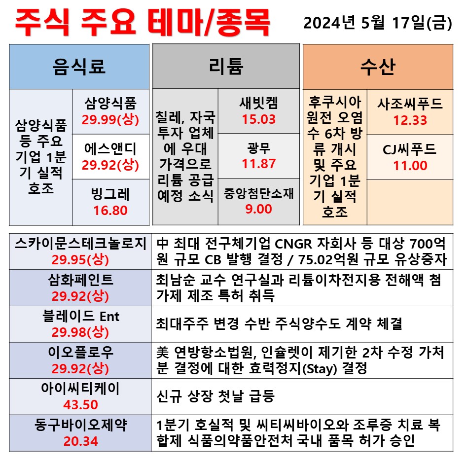 5월 17일 일일 동향 음식료 리튬 수산 #상한가 #주식 #투자