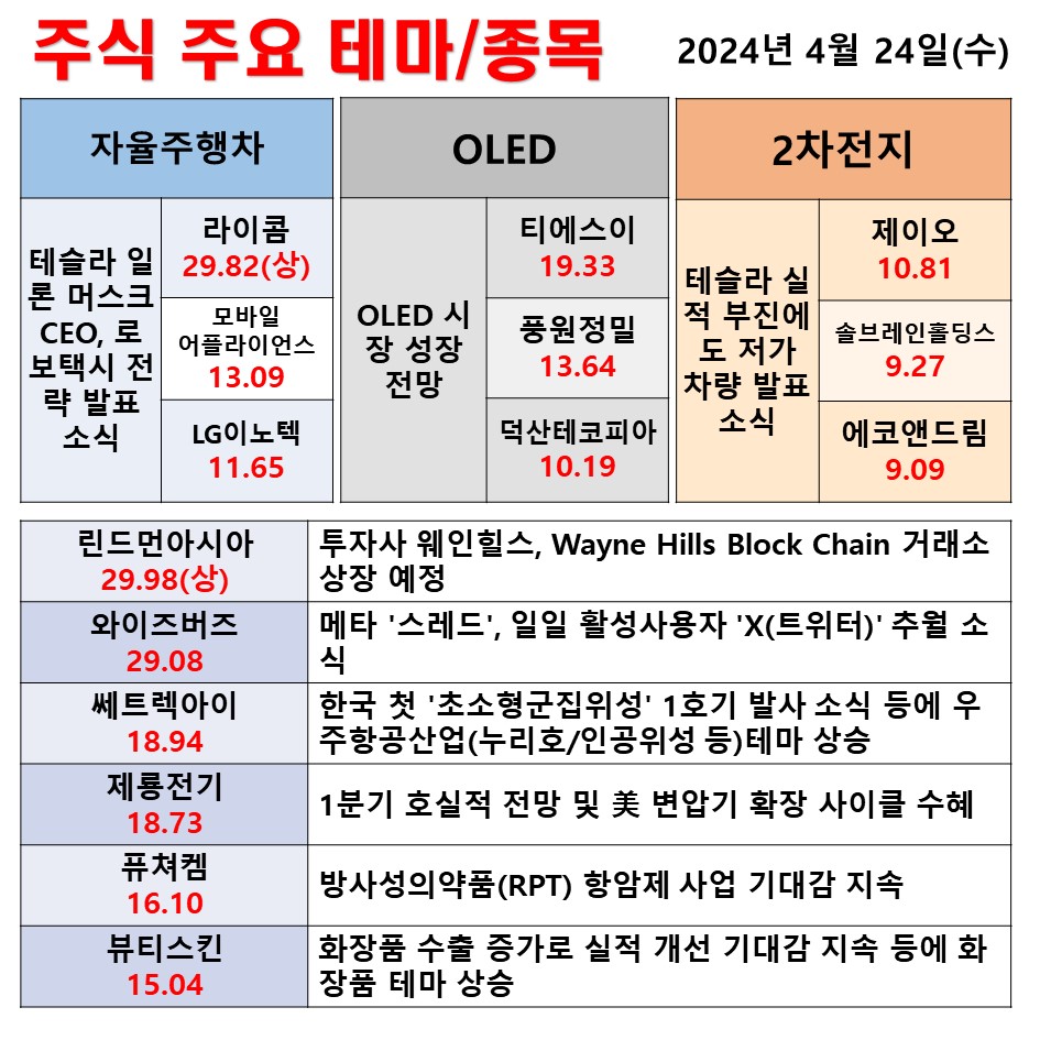 4월 24일 일일동향 자율주행차 OLED 2차전지 #테마 #상한가 #주식 #투자