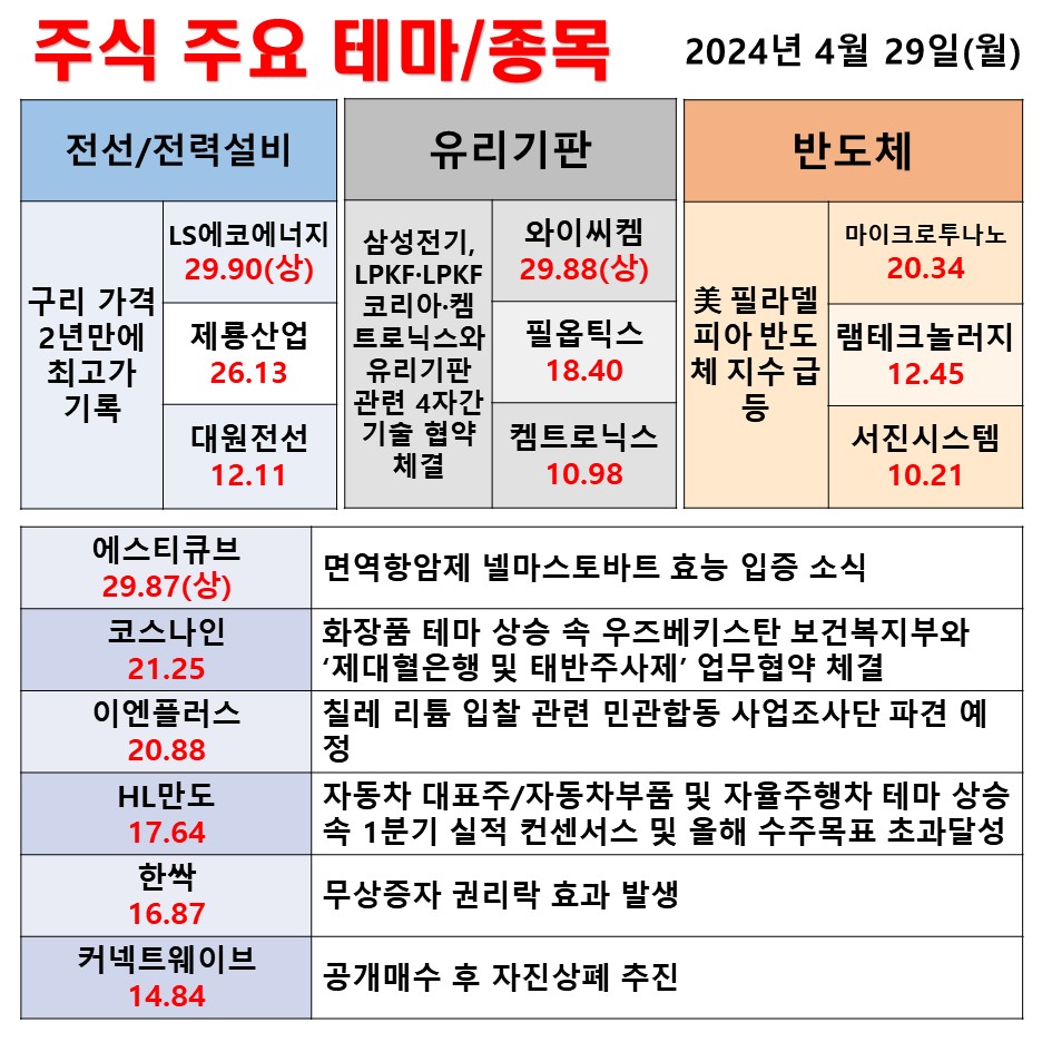 4월 29일 일일 동향 전선/전력설비 유리기판 반도체 #테마 #상한가 #주식 #투자