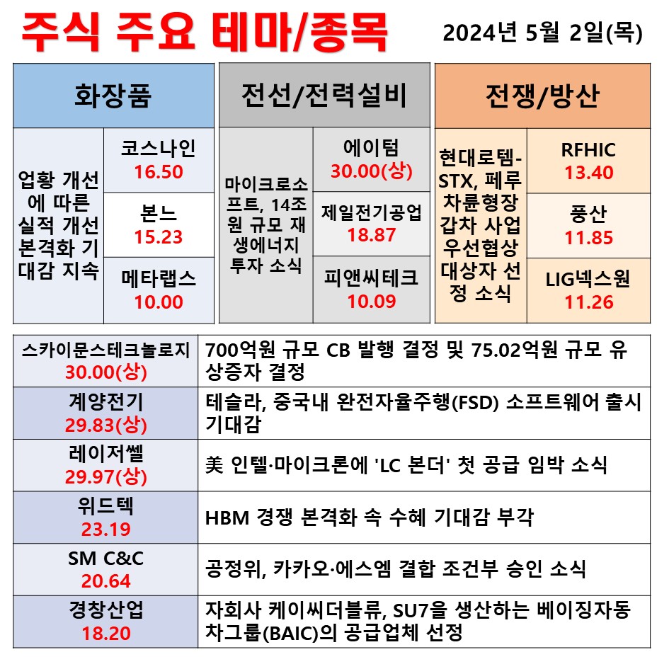 5월 2일 일일 동향 화장품 전선/전력설비 전쟁/방산 #테마 #상한가 #주식 #투자