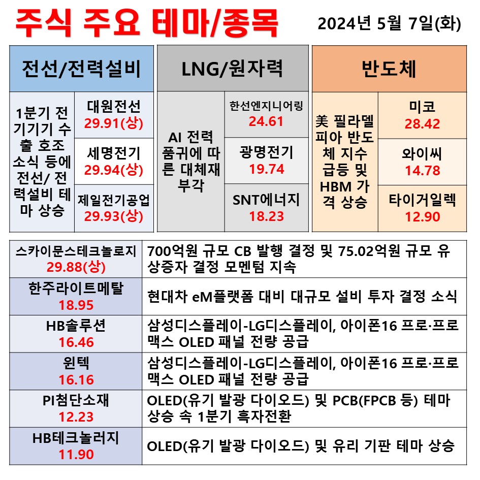 5월 7일 일일 동향 전선/전력설비 LNG/원자력 반도체 #테마 #상한가 #주식 #투자