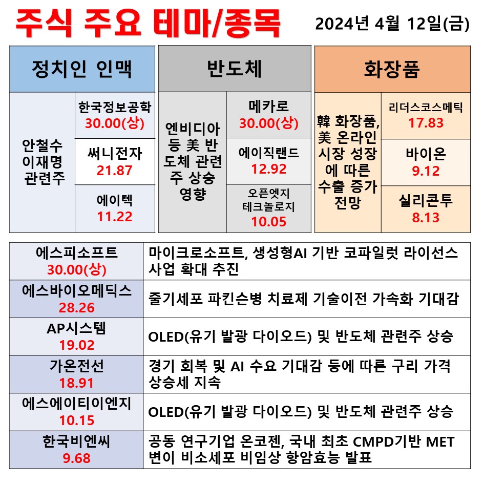 2024년 4월 12일 일간 동향 정치인맥주 반도체 화장품 #테마 #상한가 #주식 #투자