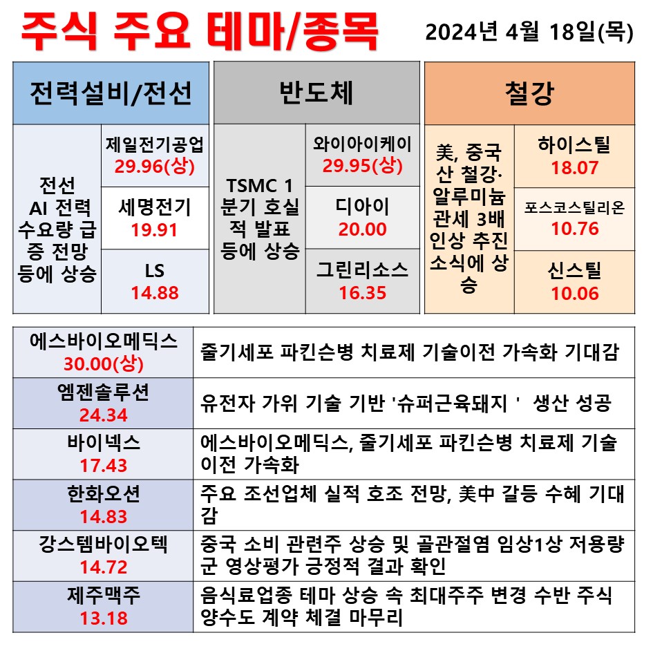 2024년 4월 18일 일일동향 전선/전력설비 반도체 철강 #테마 #상한가 #주식 #투자