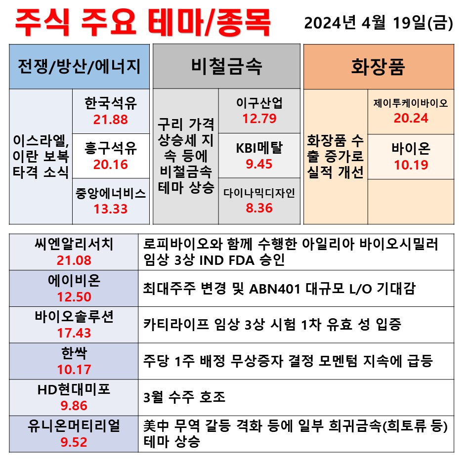 2024년 4월 19일 일일동향 전쟁/방산/에너지 비철금속 화장품 #테마 #상한가 #주식 #투자
