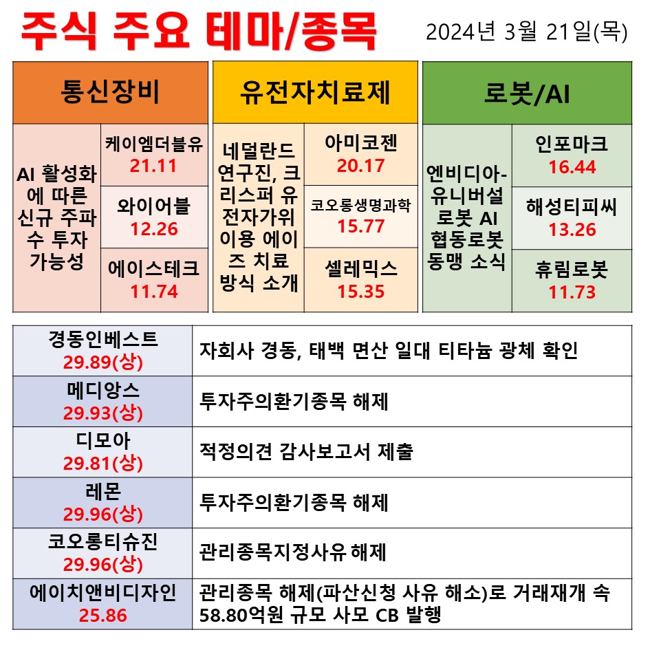 24년 3월 21일 일간 테마 상한가 동향 통신장비 / 유전자치료제 / 로봇 / AI