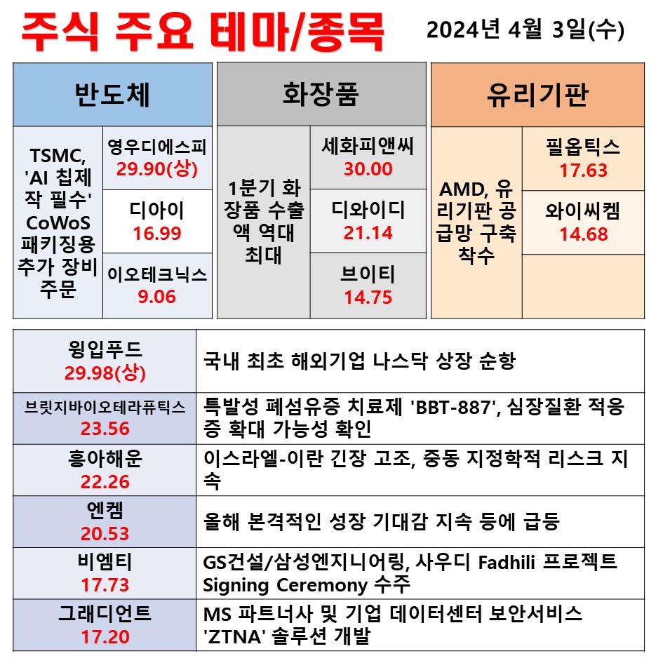 240403 일일 동향 반도체 화장품 유리기판 #테마 #상한가 #주식