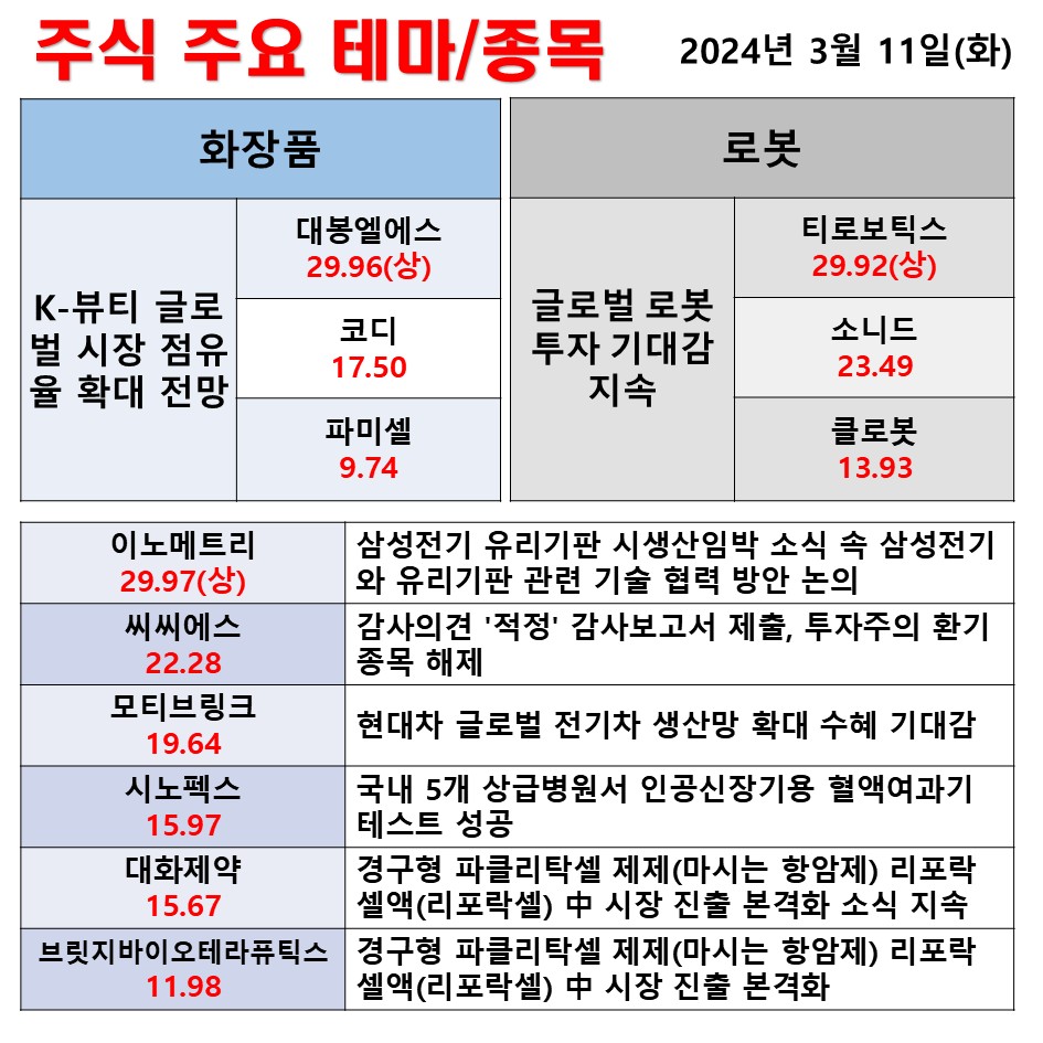 3월 11일(화) 일일 동향 화장품 로봇 #테마 #상한가 #주식 #투자