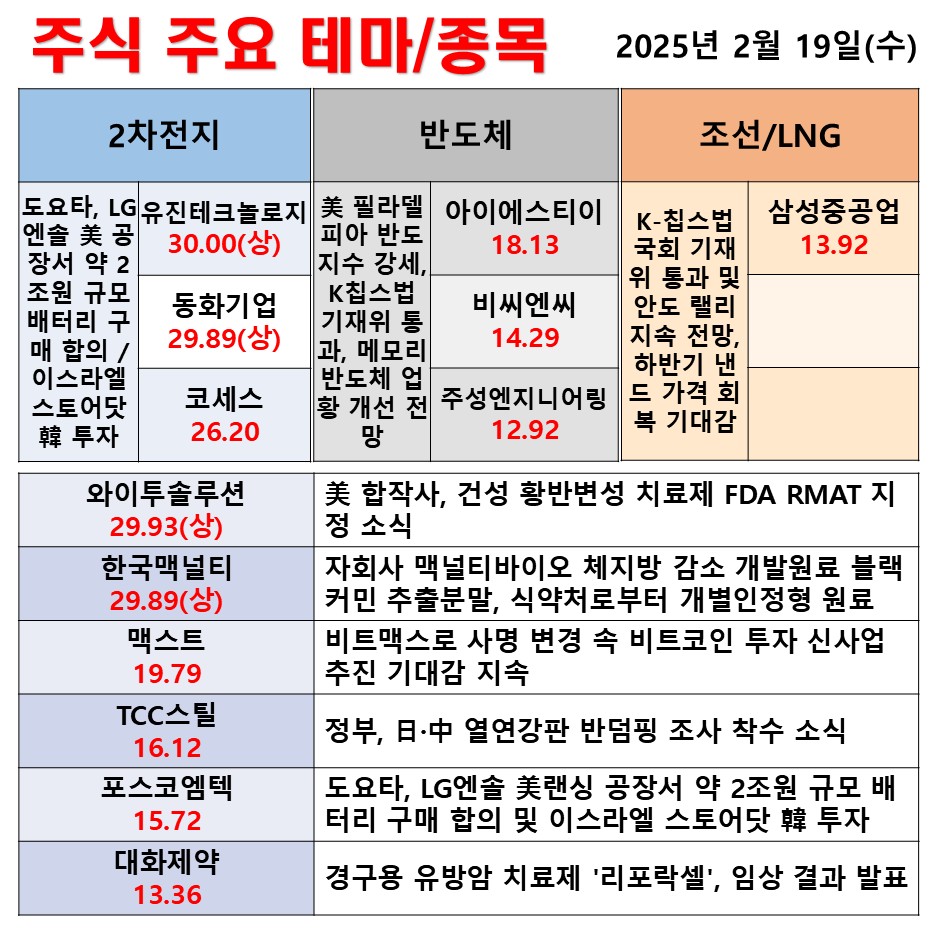 2월 19일(수) 일일 동향 2차전지 반도체 조선/LNG #테마 #상한가 #주식 #투자