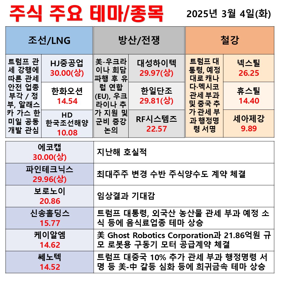 3월 4일(금) 일일 동향 조선/LNG 방산/전쟁 철강 #테마 #상한가 #주식 #투자