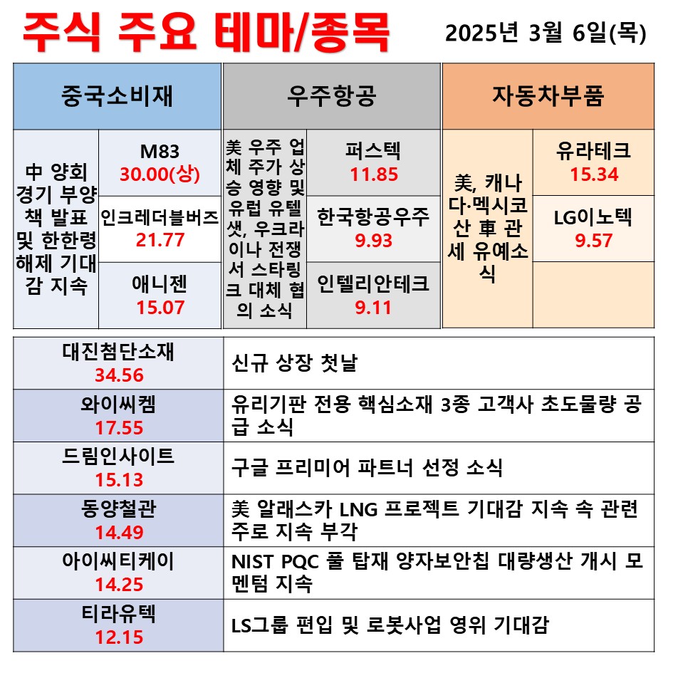 3월 6일(목) 일일 동향 중국소비재 우주항공 자동차부품 #테마 #상한가 #주식 #투자