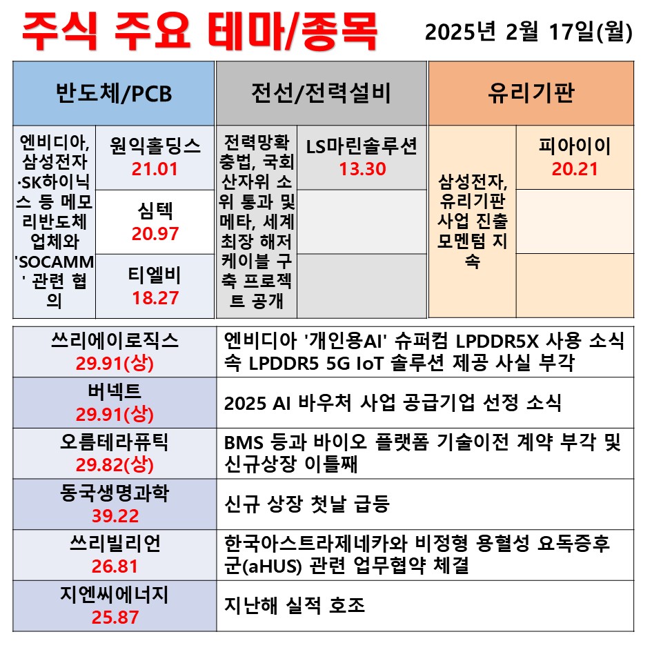 2월 17일(월) 일일 동향 반도체/PCB 전선/전력설비 유리기판 #테마 #상한가 #주식 #투자