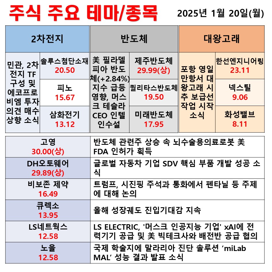 1월 20일(월) 일일 동향 2차전지 반도체 대왕고래 #테마 #상한가 #주식 #투자