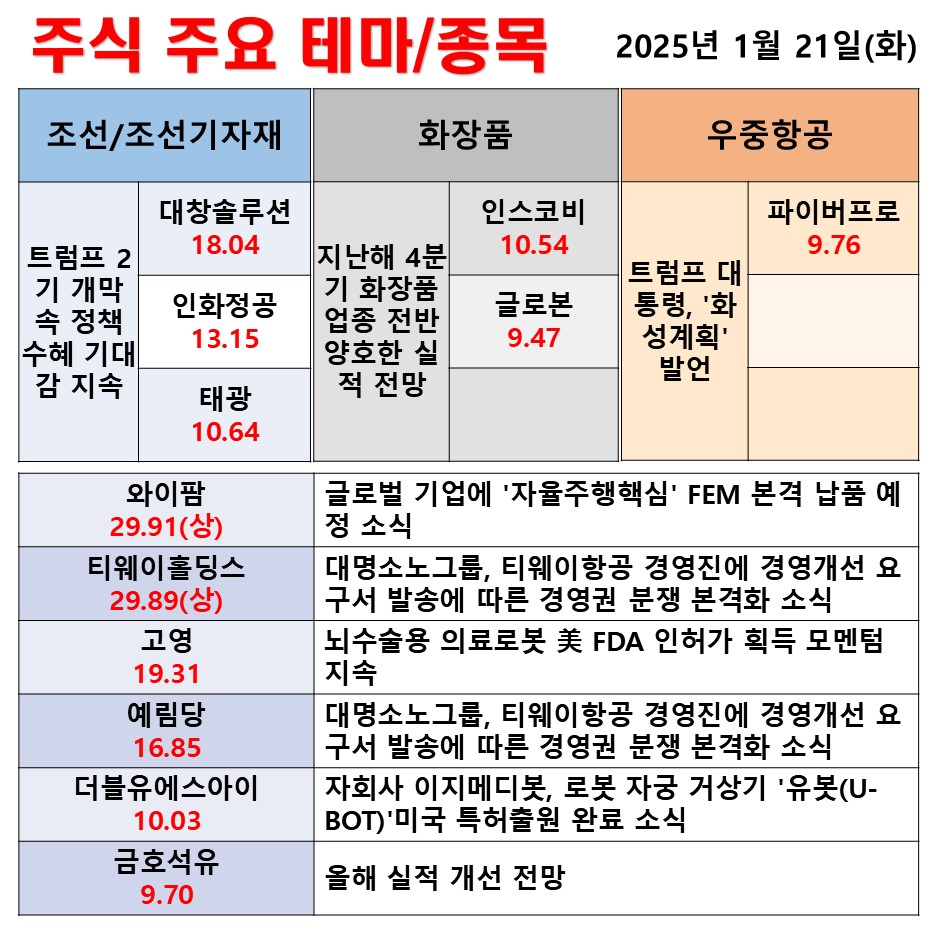 1월 21일(화) 일일 동향 조선/조선기자재 화장품 우주항공 #테마 #상한가 #주식 #투자