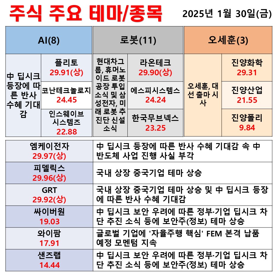 1월 30일(금) 일일 동향 AI 로봇 오세훈 #테마 #상한가 #주식 #투자