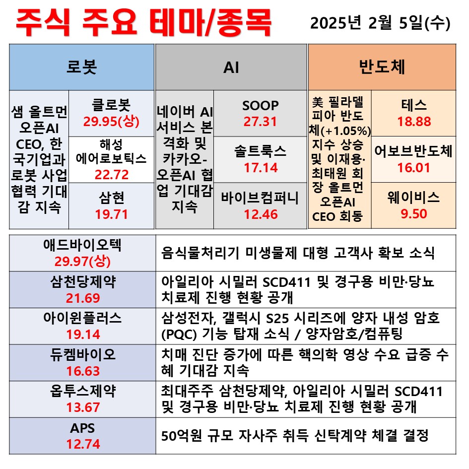 2월 5일(수) 일일 동향 로봇 AI 반도체 #테마 #상한가 #주식 #투자
