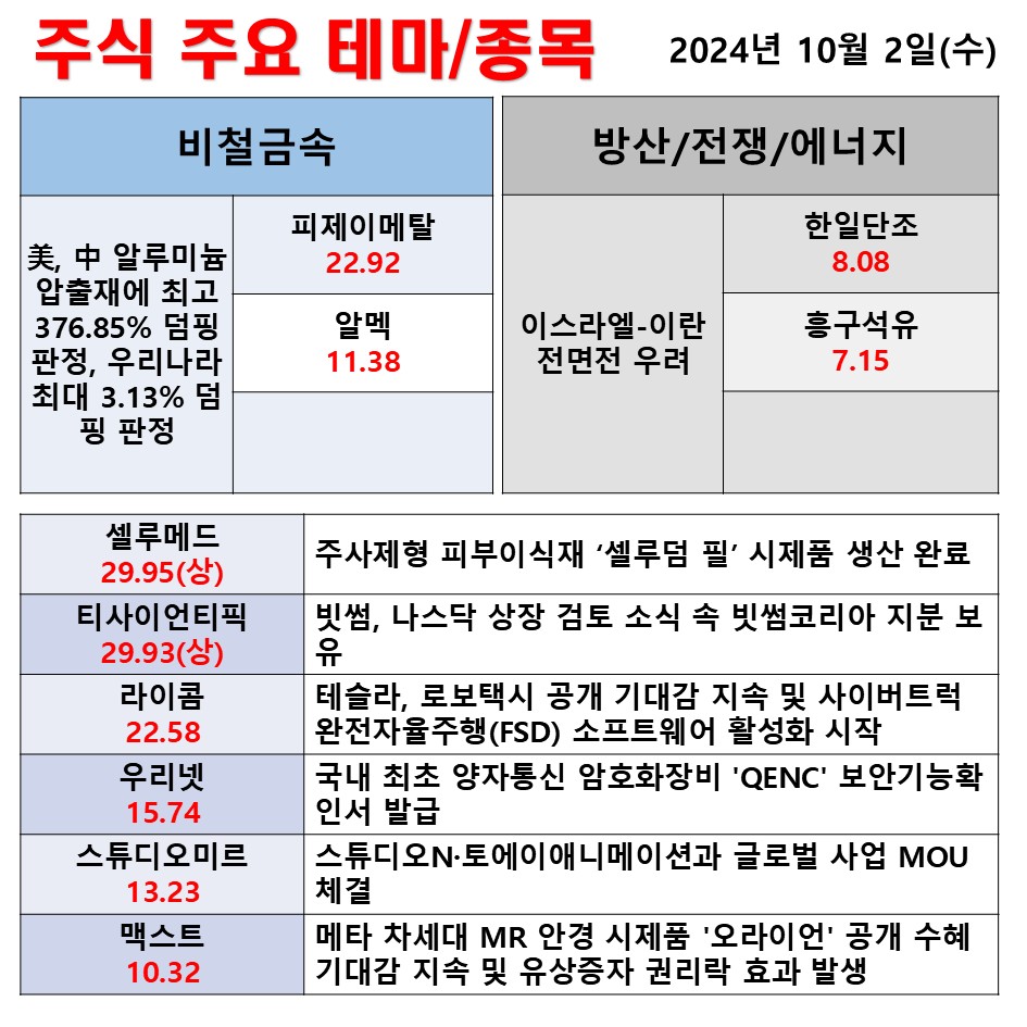 10월 2일(수) 일일 동향 비철금속 전쟁/방산/에너지 #테마 #상한가 #주식 #투자
