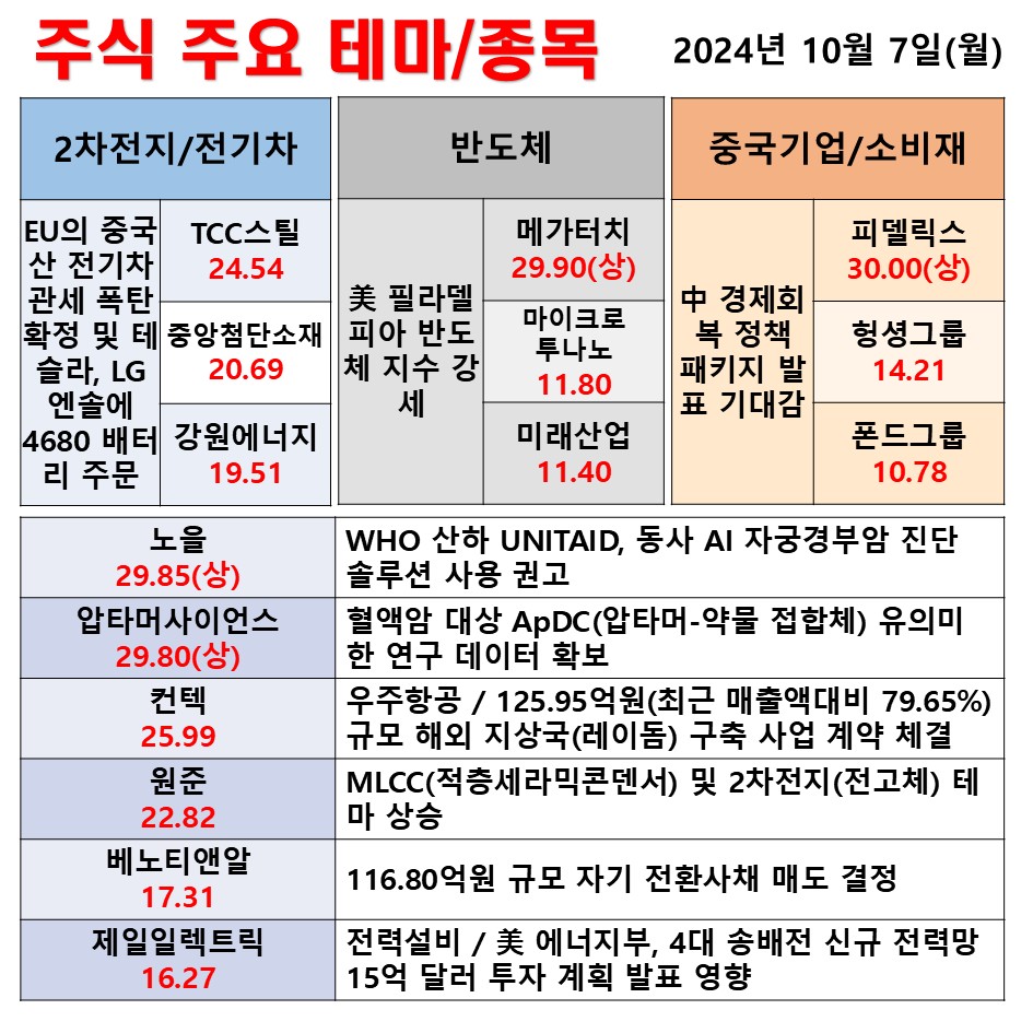 10월 7일(월) 일일 동향 2차전지/전기차 반도체 중국기업/소비재 #테마 #상한가 #주식 #투자