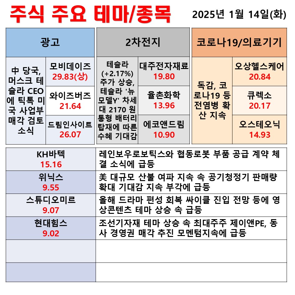 1월 14일(화) 일일 동향 광고 2차전지 코로나19/의료기기 #테마 #상한가 #주식 #투자