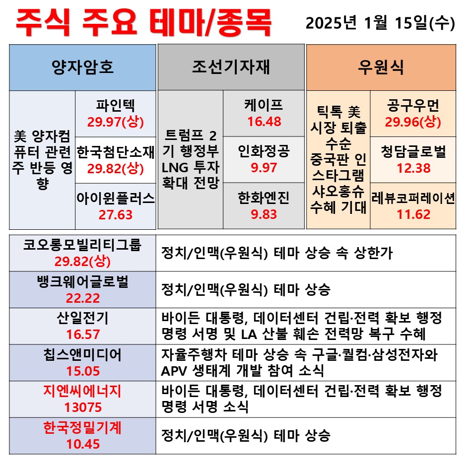 1월 15일(수) 일일 동향 양자암호 조선기자재 중국내수 #테마 #상한가 #주식 #투자