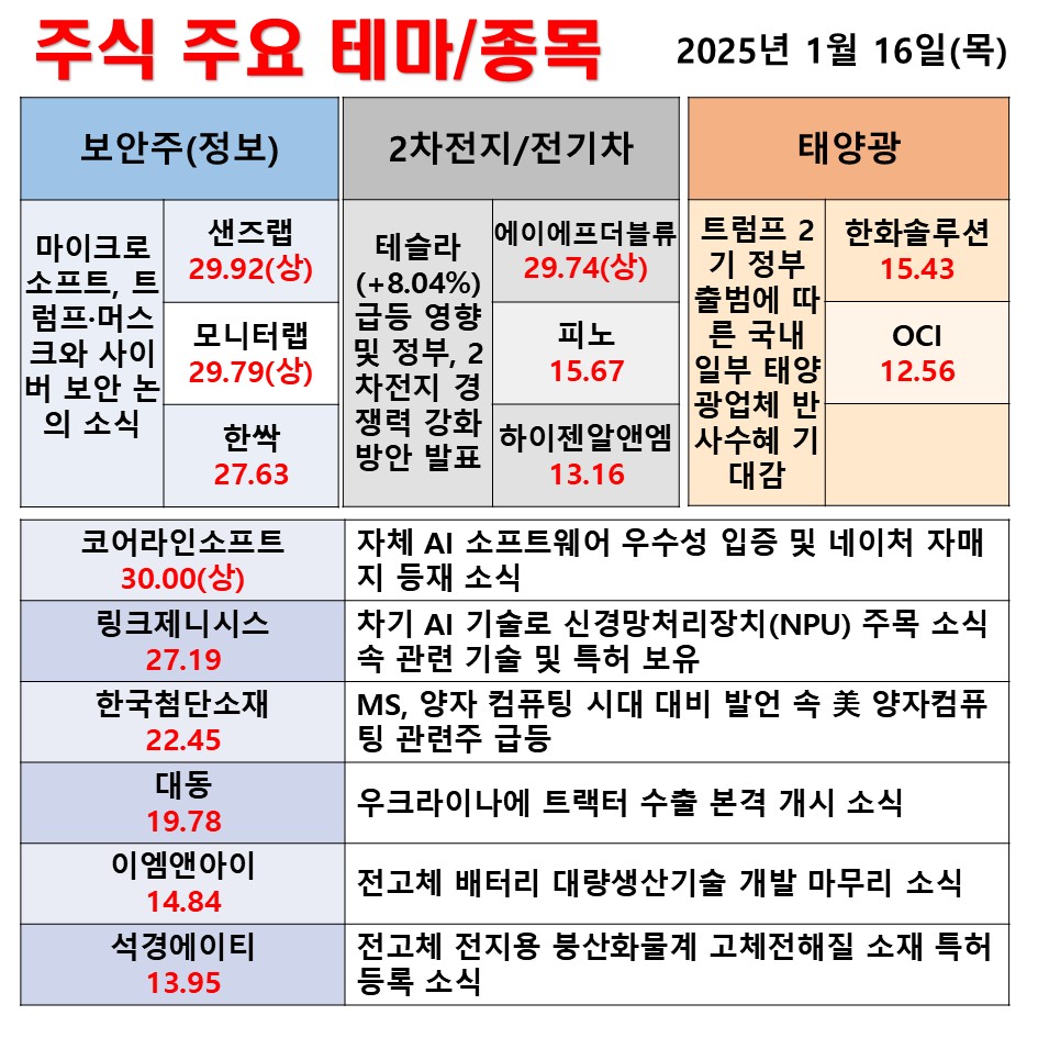1월 16일(목) 일일 동향 보안 2차전지 태양광 #테마 #상한가 #주식 #투자