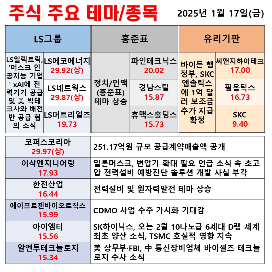 1월 17일(금) 일일 동향 LS그룹 홍준표 유리기판 #테마 #상한가 #주식 #투자