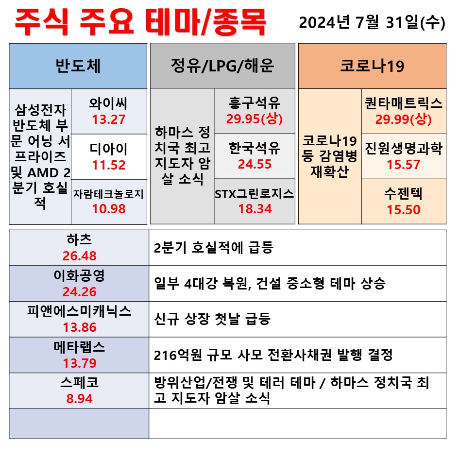 7월 31일(수) 일일 동향 반도체 정유/LPG/해운 코로나19 #테마 #상한가 #주식 #투자