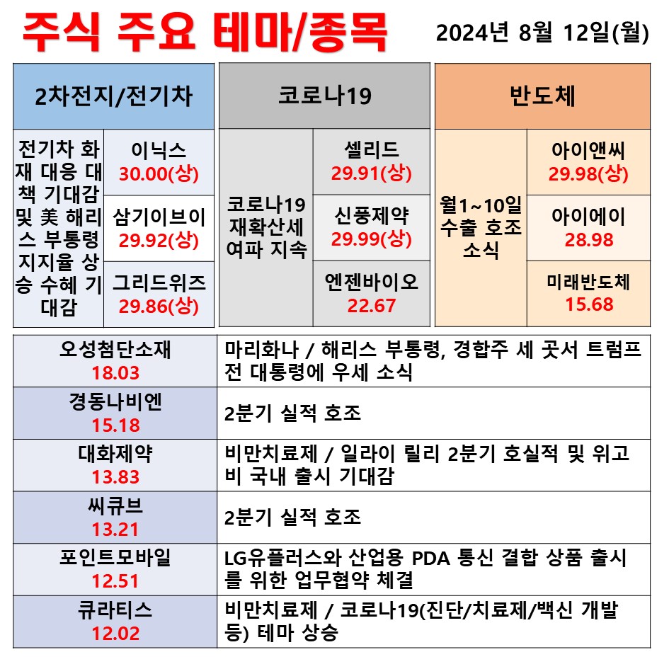 8월 12일(월) 일일 동향 2차전지/전기차 코로나19 반도체 #테마 #상한가 #주식 #투자