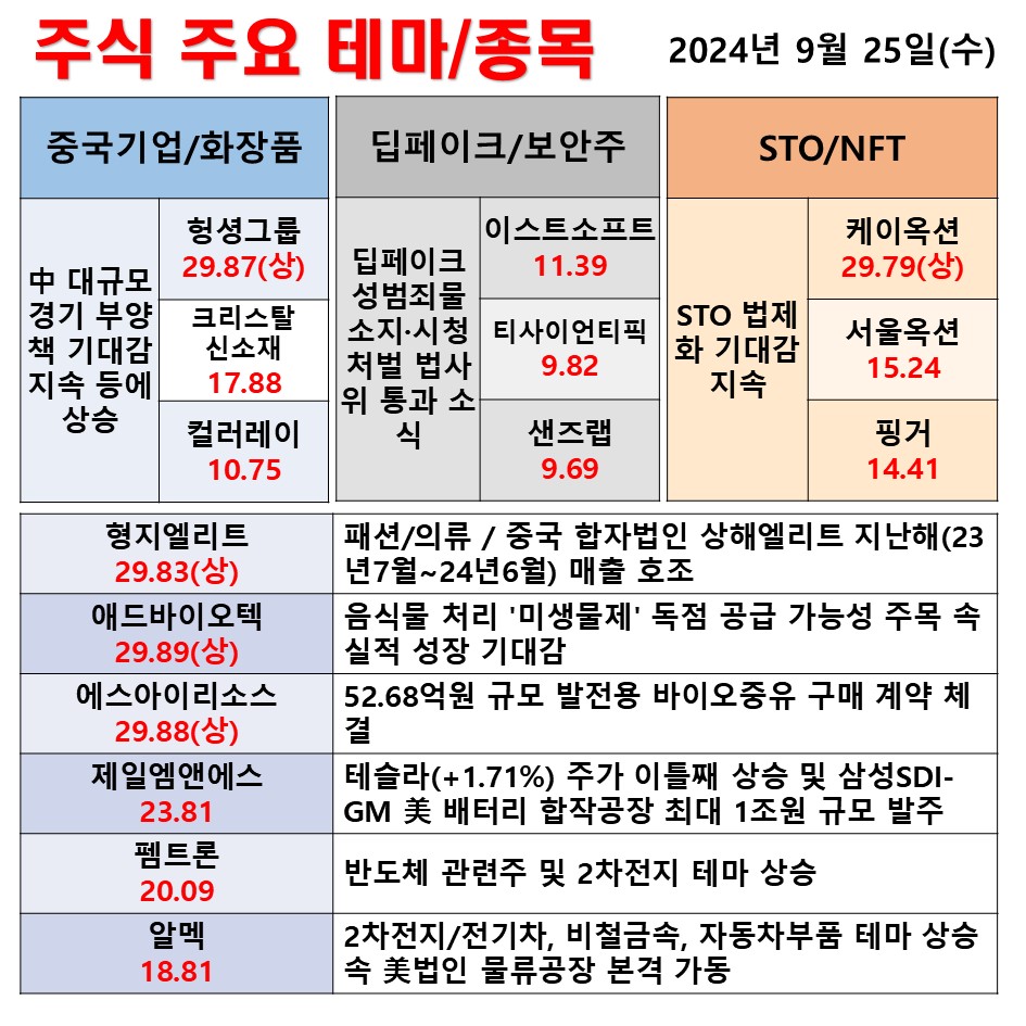 9월 25일(수) 일일 동향 중국기업/화장품 딥페이크/보안주 STO/NFT #테마 #상한가 #주식 #투자