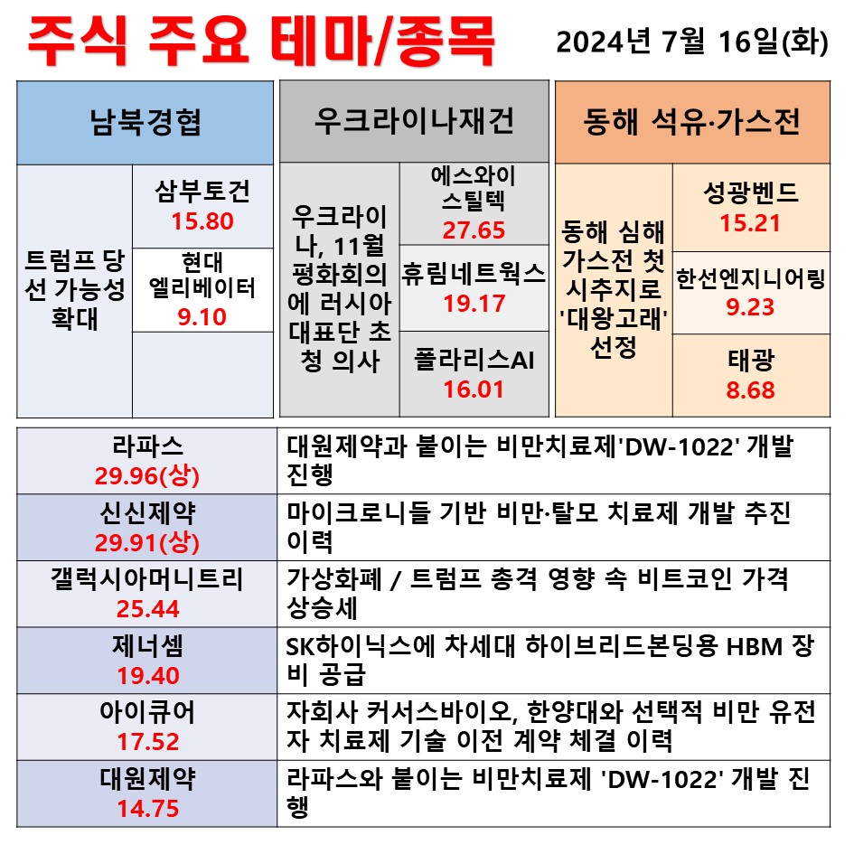 7월 16일(화) 일일 동향 남북경협 우크라이나재건 동해석유·가스전 #테마 #상한가 #주식 #투자