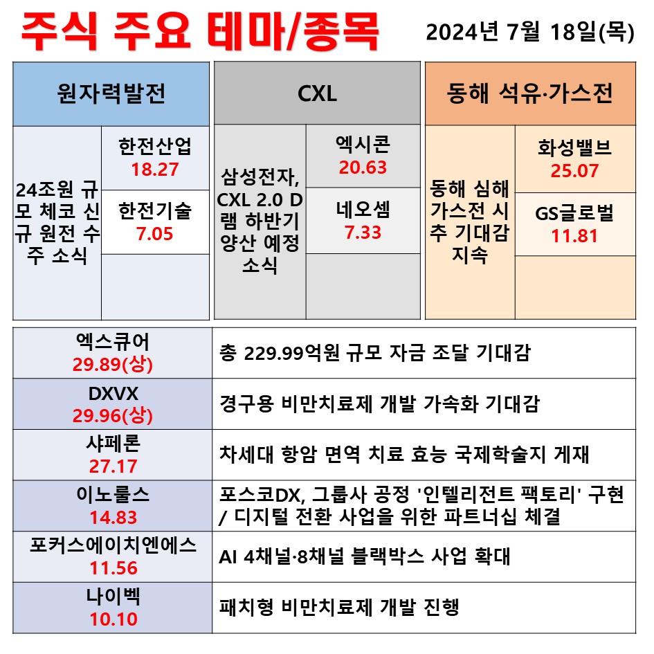 7월 18일(목) 일일 동향 원자력발전 CXL 동해 석유·가스전#테마 #상한가 #주식 #투자