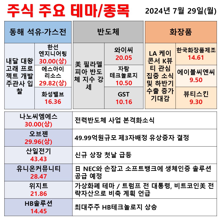 7월 29일(월) 일일 동향 동해 석유·가스전 반도체 화장품 #테마 #상한가 #주식 #투자