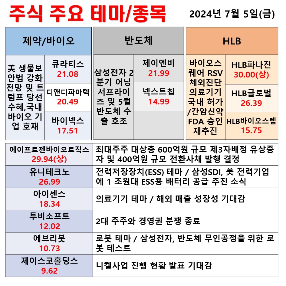 7월 5일(금) 일일 동향 제약/바이오 반도체 HLB #테마 #상한가 #주식 #투자