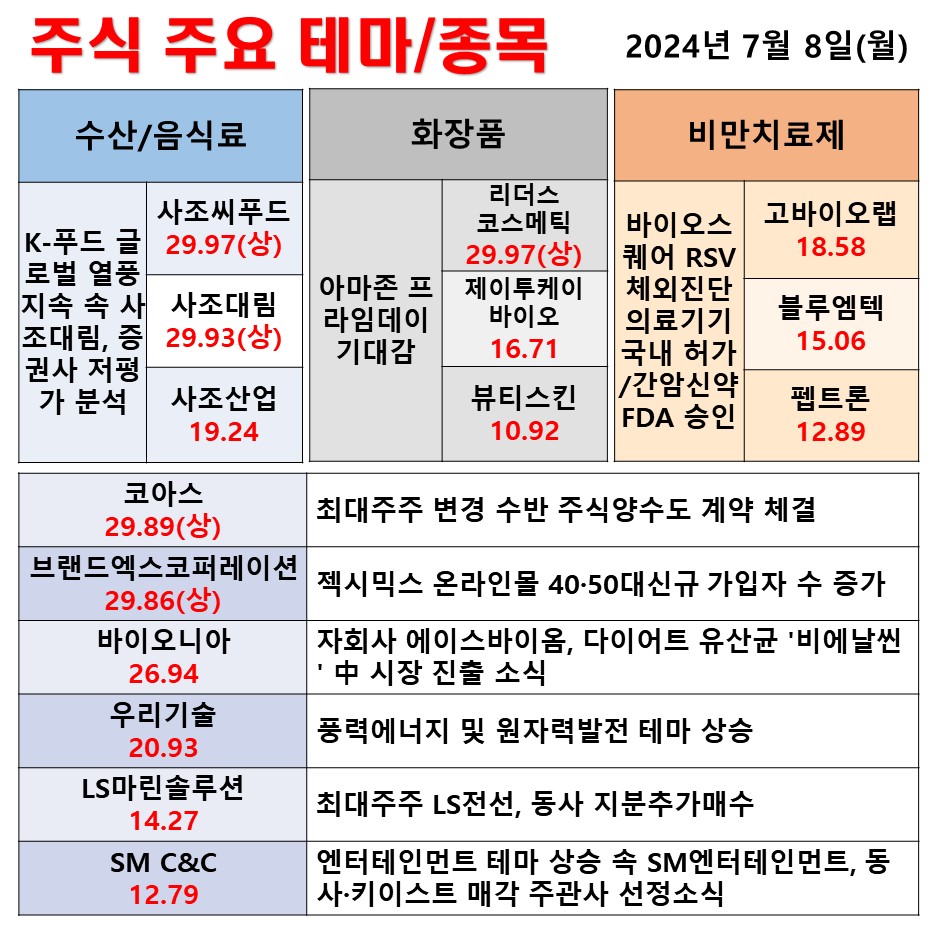 7월 8일(월) 일일 동향 수산/음식료 화장품 비만치료제 #테마 #상한가 #주식 #투자