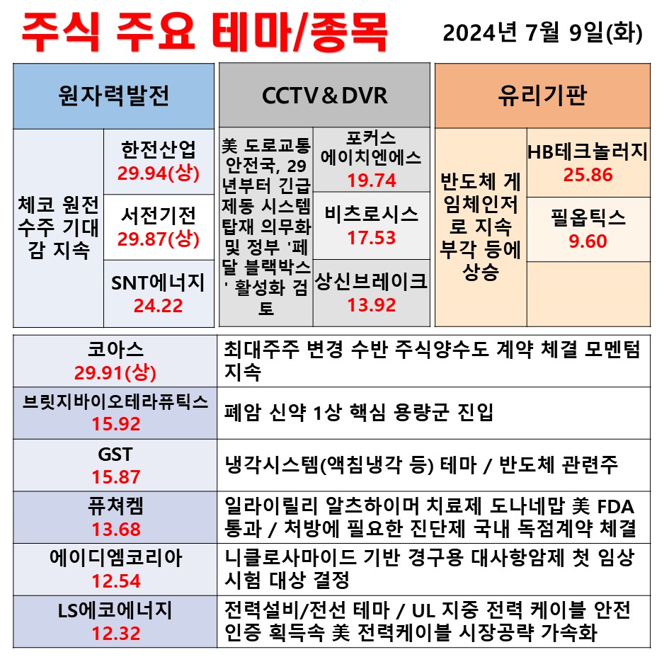 7월 9일(화) 일일 동향 원자력발전 CCTV&DVR 유리기판 #테마 #상한가 #주식 #투자
