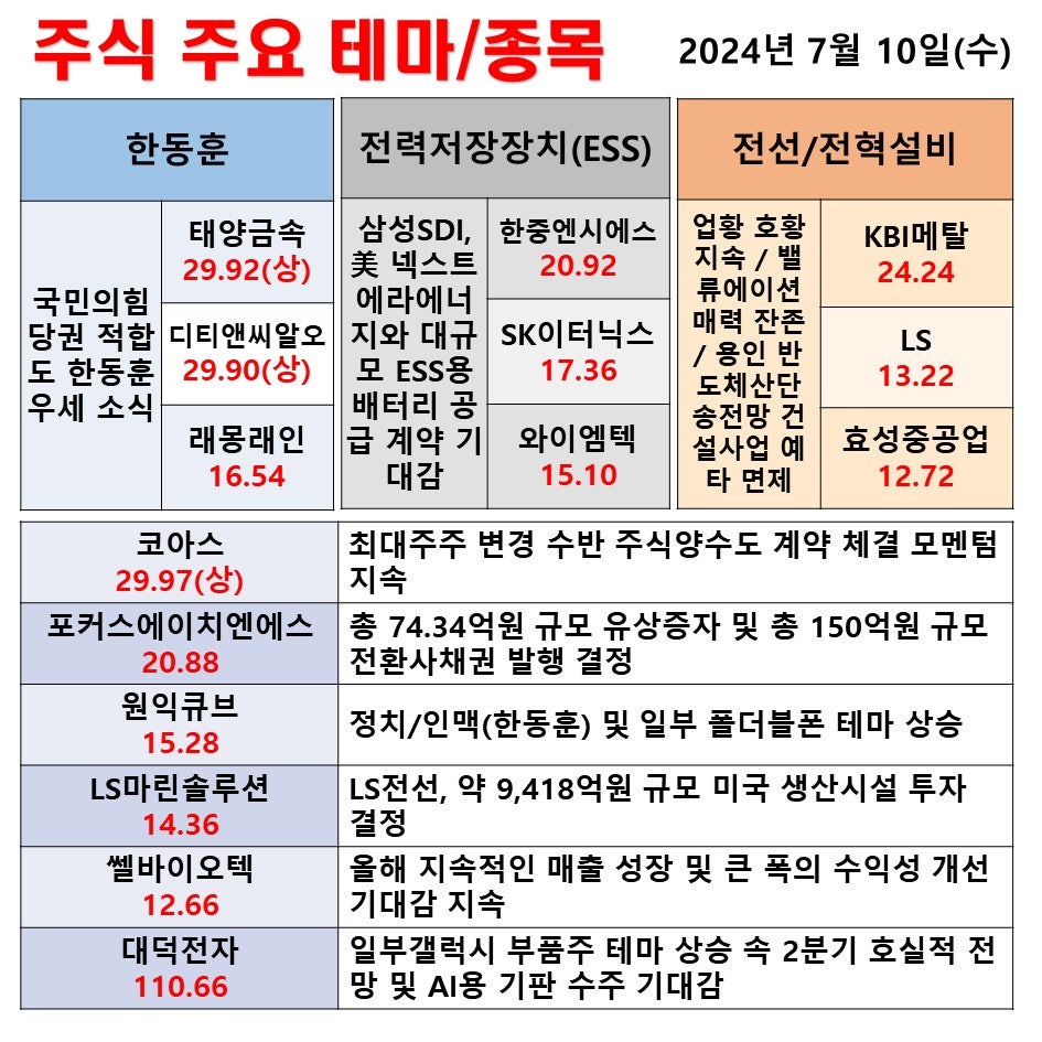 7월 10일(수) 일일 동향 한동훈 전력저장장치 전선/전력설비 #테마 #상한가 #주식 #투자
