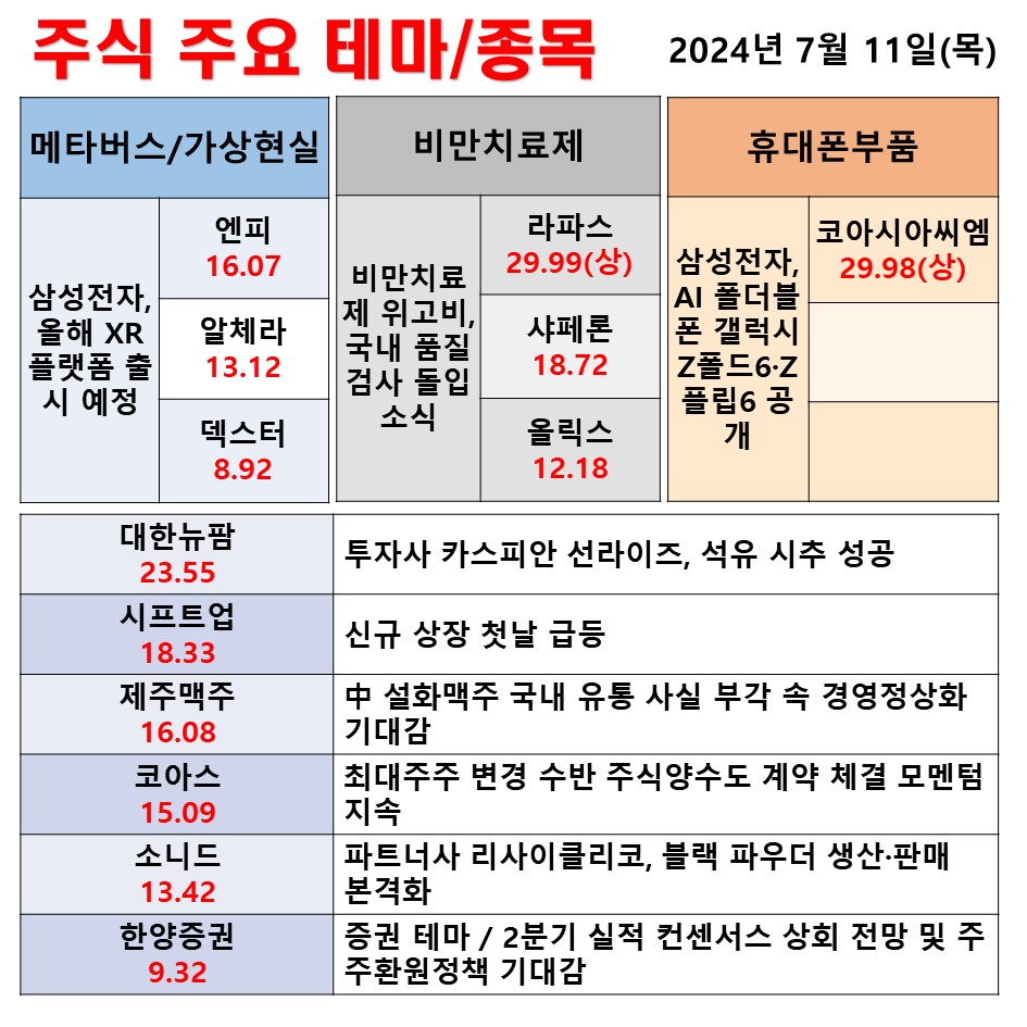 7월 11일(목) 일일 동향 메타버스/가상현실 비만치료제 휴대폰부품 #테마 #상한가 #주식 #투자