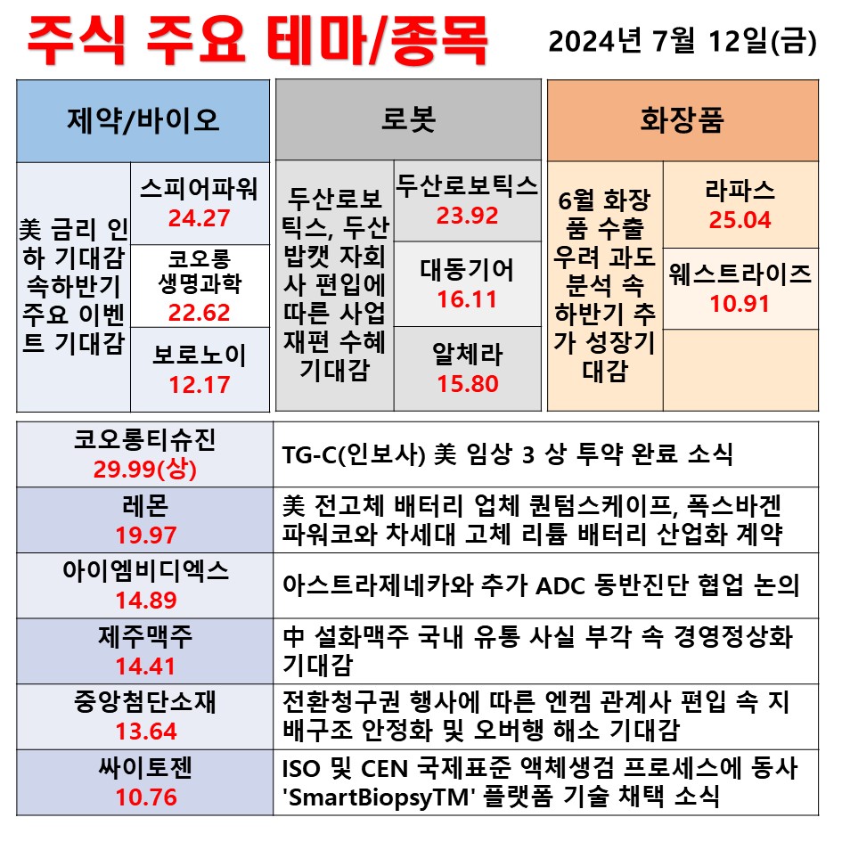 7월 12일(금) 일일 동향 제약/바이오 로봇 화장품 #테마 #상한가 #주식 #투자
